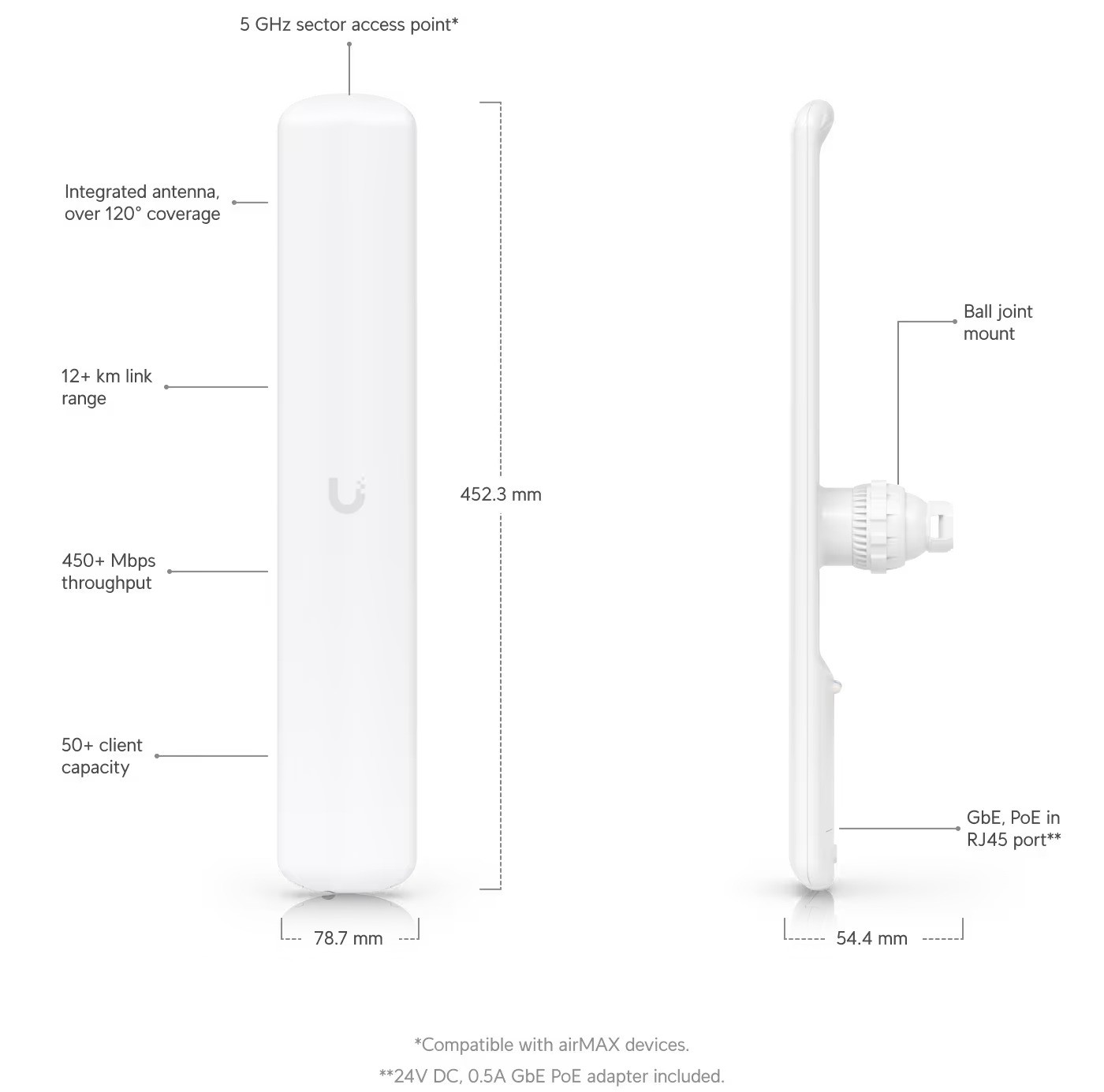 LAP-120 که با دقت طراحی شده است، بخشی از خط تولید محصولات airMAX است که به طور خاص برای ارائه عملکرد برتر در شبکه‌های ارائه دهنده خدمات اینترنت بی‌سیم (WISP) و سایر کاربردها مهندسی شده‌اند. این دستگاه در باند فرکانسی 5 گیگاهرتز کار می‌کند و تعادل بین اتصال دوربرد و عملکرد با توان عملیاتی بالا را بهینه می‌کند. این انتخاب فرکانس تضمین می‌کند که LAP-120 می‌تواند پهنای باند قابل توجهی را برای پشتیبانی از تقاضای روزافزون برای خدمات فشرده داده ارائه دهد، در عین حال تداخل سایر دستگاه‌هایی که در باندهای متراکم‌تر کار می‌کنند را به حداقل برساند.درست مانند نمونه قبلی خود، این اکسس پوینت فشرده در فضای باز با آنتن بخش یکپارچه برای راه اندازی اتصالات نقطه به (چند نقطه) در نظر گرفته شده است. شبکه دو یا چند مکان را متصل می کند. LiteAP AC روی WiFi 5 (در فرکانس 5 گیگاهرتز) کار می کند. آنتن داخلی 2×2 MIMO می تواند با چندین CPE ac airMAX در محدوده 120 درجه ارتباط برقرار کند. توان انتقال این مدل 25dBm (316mW) و بهره آن 16dBi است.