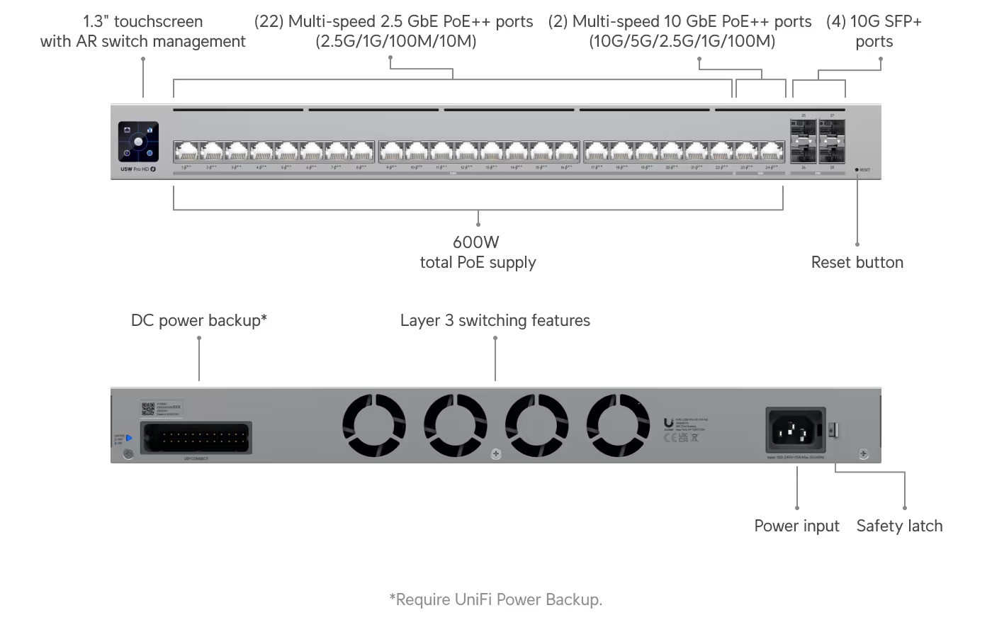 سوئیچ Ubiquiti UniFi Switch Pro HD 24 PoE (USW-Pro-HD-24-PoE) یک سوئیچ لایه 3 حرفهای است که برای پاسخگویی به نیازهای شبکههای مدرن طراحی شده است. این سوئیچ دارای دو پورت 10 گیگابیت اترنت (GbE) PoE++، بیست و دو پورت 2.5 گیگابیت PoE++ و چهار پورت 10G SFP+ است که در مجموع توان عملیاتی 115 گیگابیت بر ثانیه و ظرفیت سوئیچینگ 230 گیگابیت بر ثانیه را فراهم میکند. این پیکربندی قوی، نرخ انتقال داده سریع را تضمین میکند و برنامههای کاربردی با پهنای باند بالا مانند پخش ویدئو با کیفیت بالا، بازیهای آنلاین و انتقال فایلهای بزرگ را در خود جای میدهد.