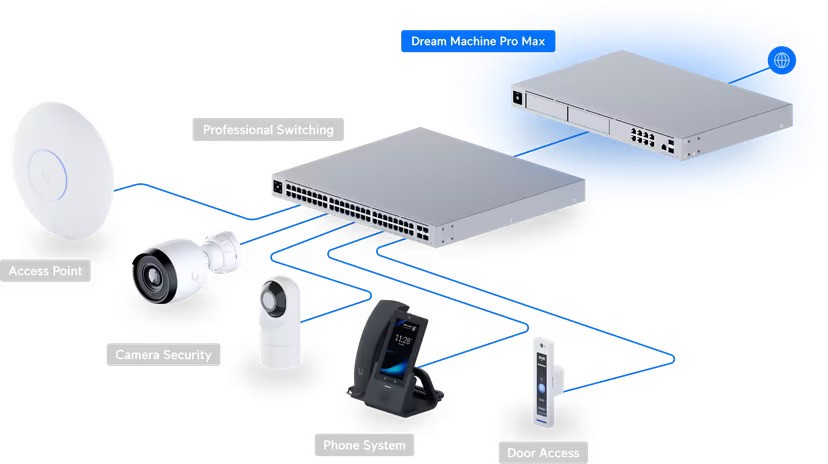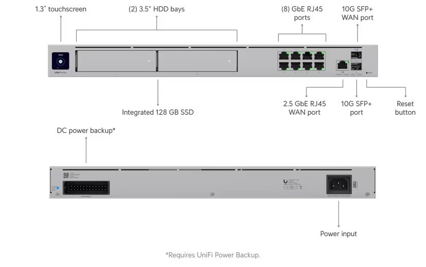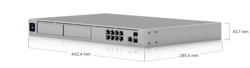 UDM Pro Max یک دستگاه همه کاره با پردازنده چهار هسته ای 2 گیگاهرتز بوده که برای شبکه های سازمانی و همچنین برای کسب و کار های کوچیک تا متوسط طراحی شده است و مورد استفاده قرار می گیرد. UDM Pro Max را می توان به عنوان Unifi Controller ونرم افزار نظارت تصویری،با یک (Gateway) دروازه امنیتی قوی با کارایی بالا در شبکه سازمانی خود مورد استفاده قرار دارد . UDM Pro Max قابلیت اینو دارد که در قالب یک سوئیچ داخلی در نظر گرفت که بر روی خود یک محفظه هارد دیسک دارد که از هارد های 3.5 اینچی پشتیبانی می کند